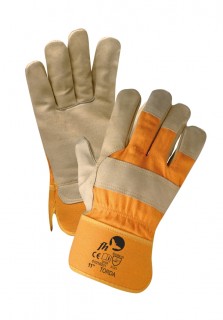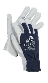 Kombinované rukavice z hovädzej štiepenky a textilu. Zosilnená dlaň s podšívkou, tkanina na chrbte.