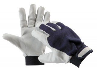 Rukavice šité z jemnej lícovej kozinky v dlani, modrej bavlnenej tkaniny na chrbte a s manžetou na suchý zips.